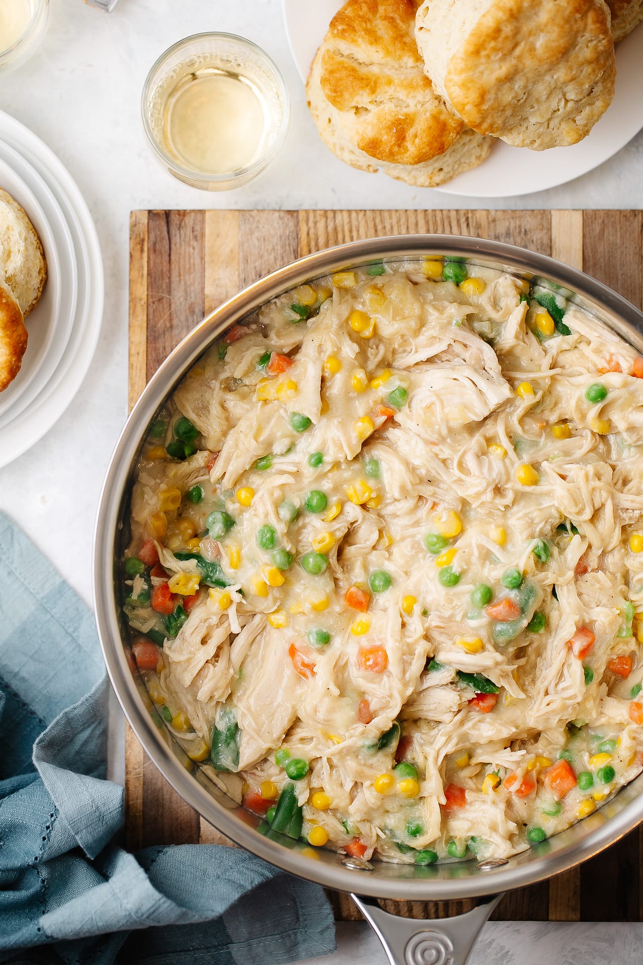 La clave para prepararlos rápidamente es utilizar carne de pollo asado comprada en la tienda (o sobras de pollo o pavo cocido), bolsas de verduras mixtas congeladas y paquetes de galletas refrigeradas. Con estos ayudantes, puedes hacer tu propia salsa cremosa de pollo con mantequilla, aceite de oliva, cebolla, ajo, harina, caldo de pollo y leche. Esta tumba/salsa es increíblemente delicioso Por eso esta receta se convertirá en la favorita de la familia.
