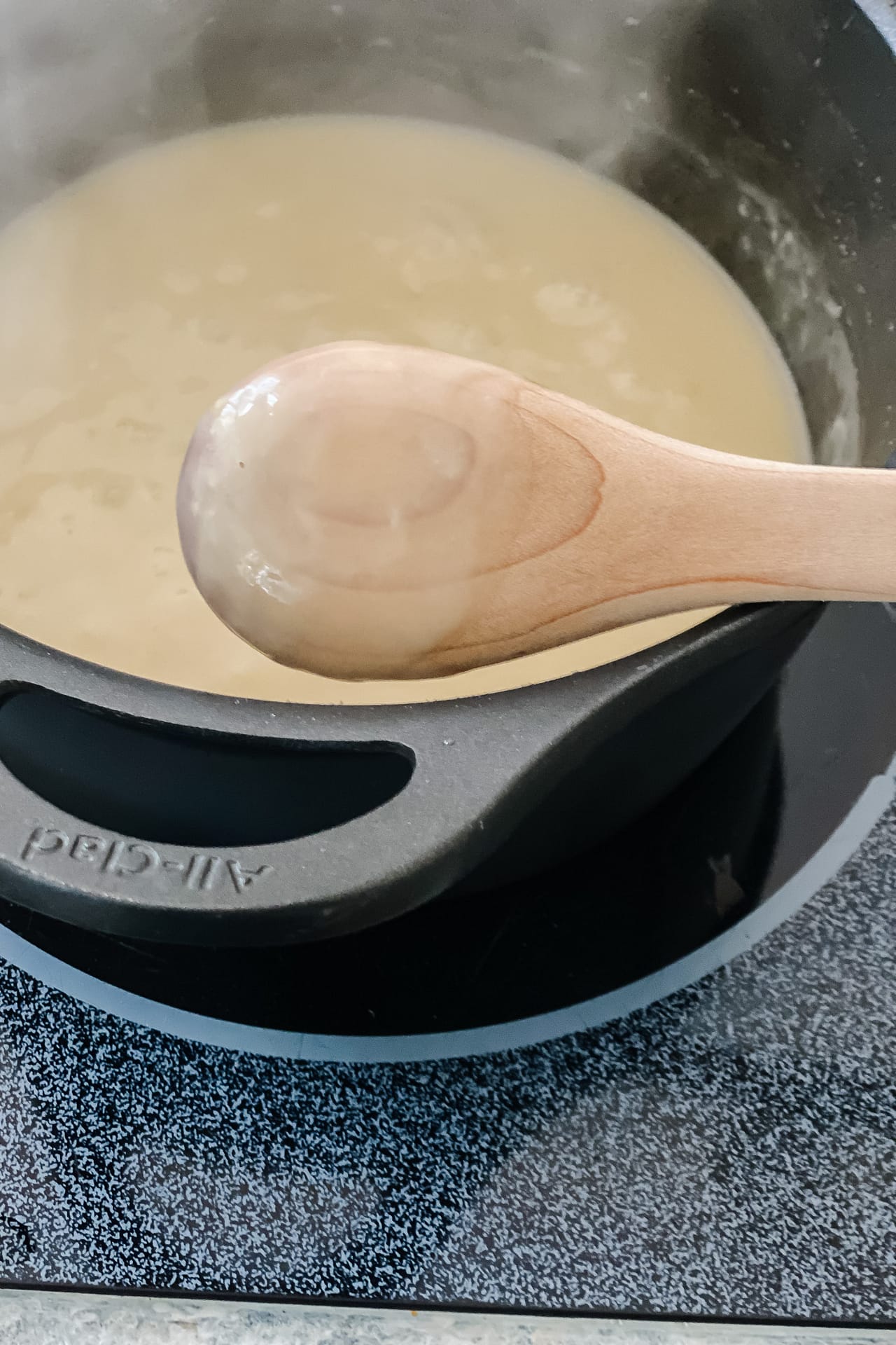 Combine lentamente 2 3/4 tazas de caldo de pollo y 1/2 taza de leche. Yo uso leche entera, pero creo que la leche al 2% o sin grasa también funcionaría. Es posible que no obtenga exactamente el mismo nivel de cremosidad. Lleva esta mezcla a ebullición y continúa cocinando hasta que espese. Cocine a fuego lento hasta que espese lo suficiente como para cubrir una cuchara, aproximadamente de 5 a 8 minutos.