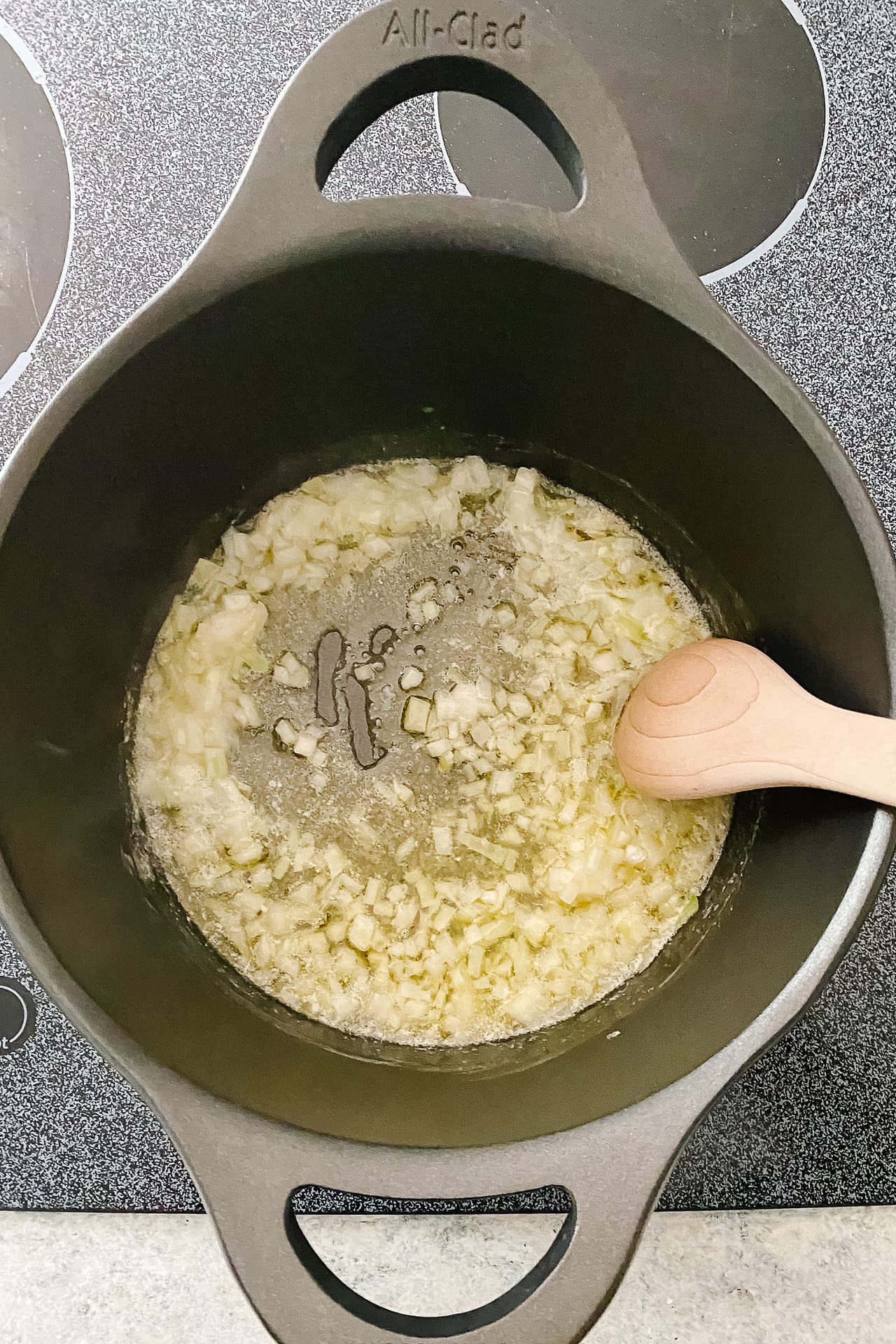 Luego, agrega 1/2 taza de cebolla finamente picada y 2 dientes de ajo picados. Cocine, revolviendo frecuentemente, hasta que las cebollas estén suaves, aproximadamente 5 minutos.
