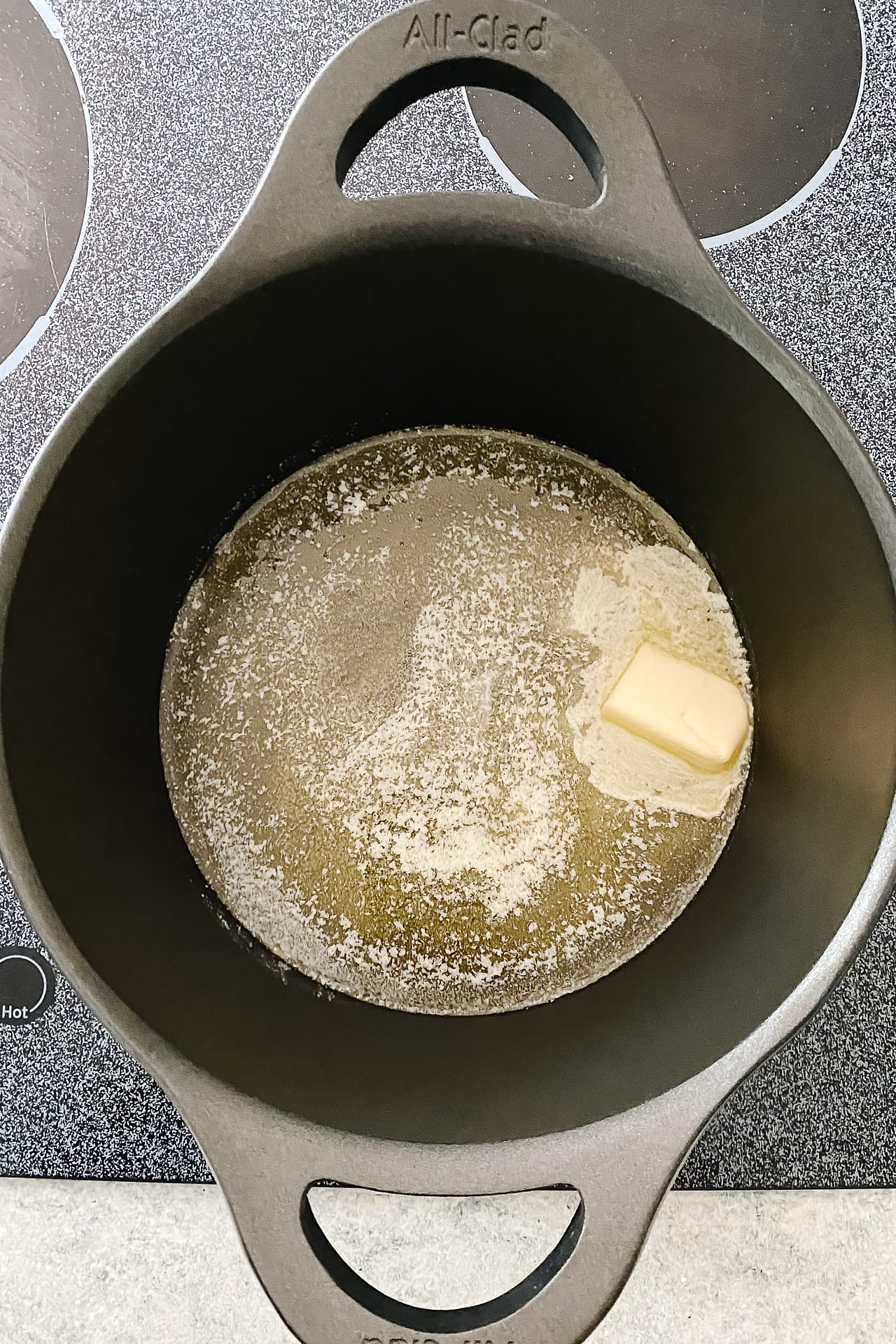 Haz una regla. Agregue 1/3 de taza de harina para todo uso y cocine por 3 minutos, revolviendo con frecuencia. La mezcla adquirirá un color dorado claro.