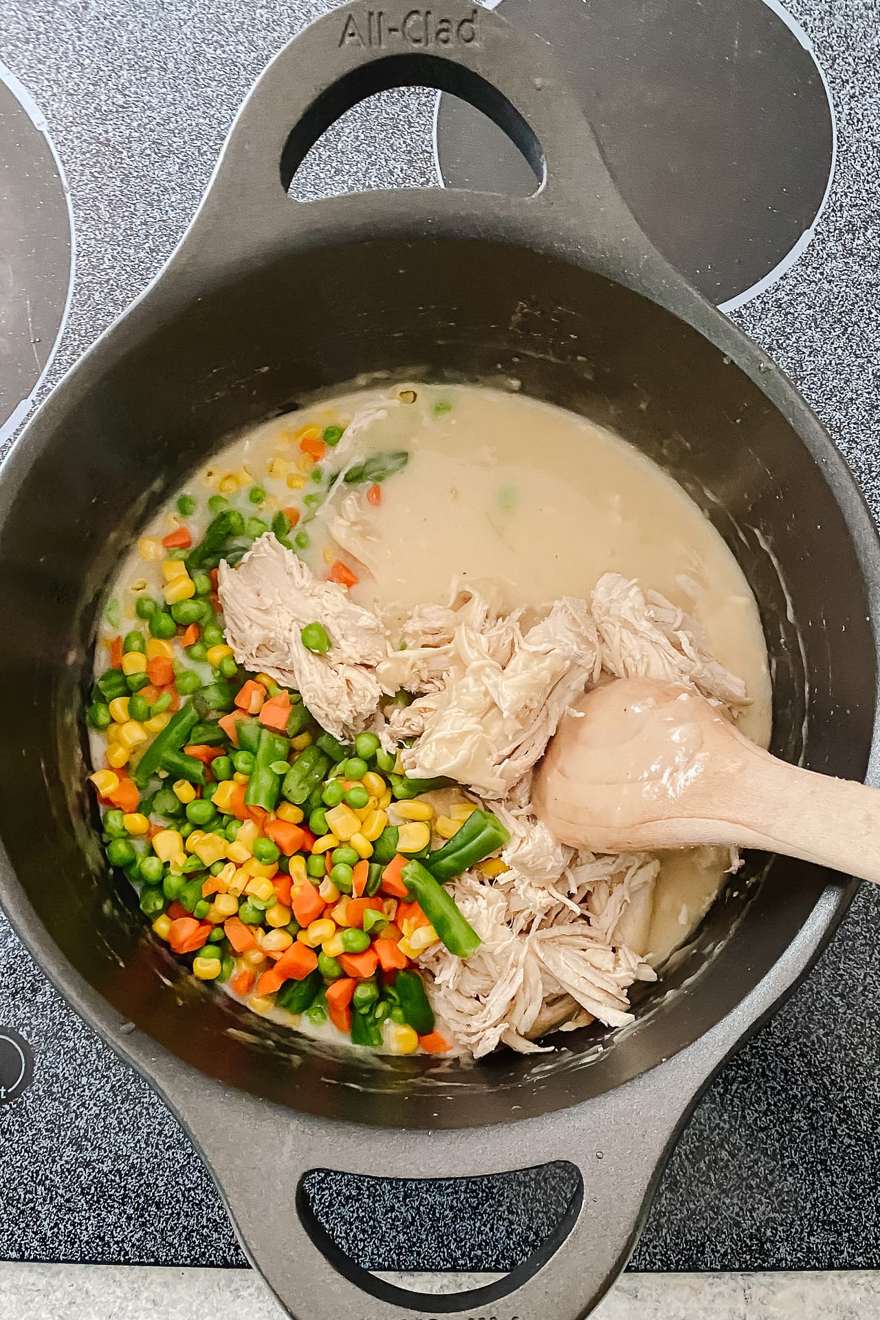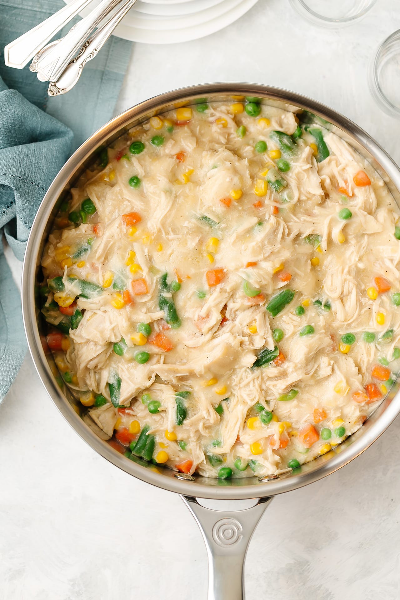Agregue 4 tazas de pollo cocido picado o desmenuzado y 1 bolsa (10 oz) de mezcla de verduras descongelada. Cocine a fuego lento hasta que el pollo y las verduras estén bien cocidos, aproximadamente 5 minutos. Prueba la mezcla y agrega sal y pimienta al gusto. Por lo general, agrego al menos 1/4 de cucharadita de sal y 1/4 de cucharadita de pimienta negra, pero tenga en cuenta: la cantidad de sal que agregue depende del sabor salado del caldo de pollo que use (regular o bajo en sodio) y de si tiene pollo o no. . Eso depende. El condimento era fuerte (pollo asado comercial y pechuga de pollo escalfada).