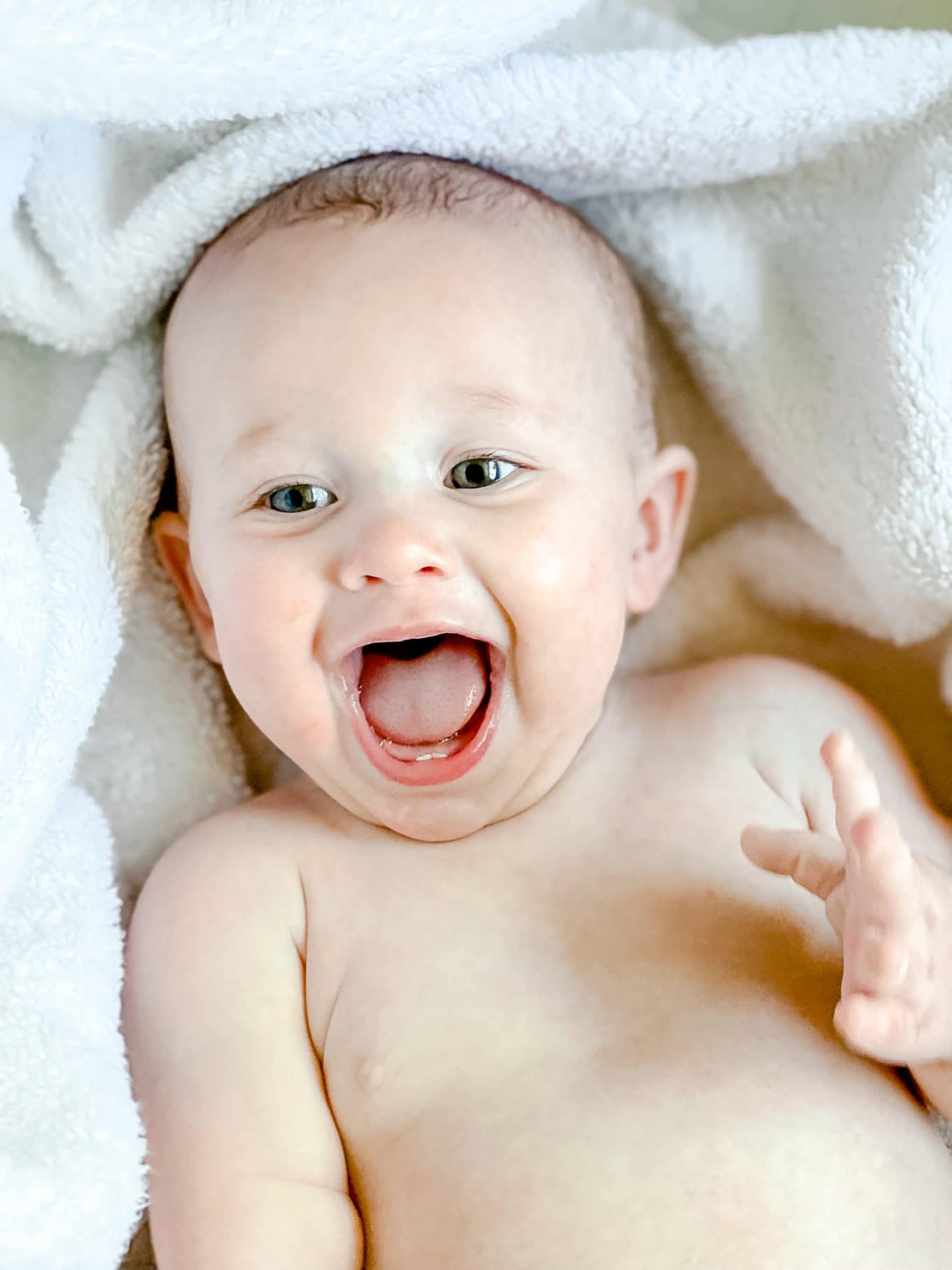 Aunque le gusta sonreír, se ríe mucho. Daniel y yo estamos constantemente haciendo cosas nuevas, tratando de motivarlo, pero sobre todo él nos da esta dulce y educada sonrisa y arrullos, básicamente diciendo, ustedes son preciosos. Pero de vez en cuando, realmente chocas con algo y se produce un fuerte parloteo. Es muy satisfactorio. de este modo satisfactorio.