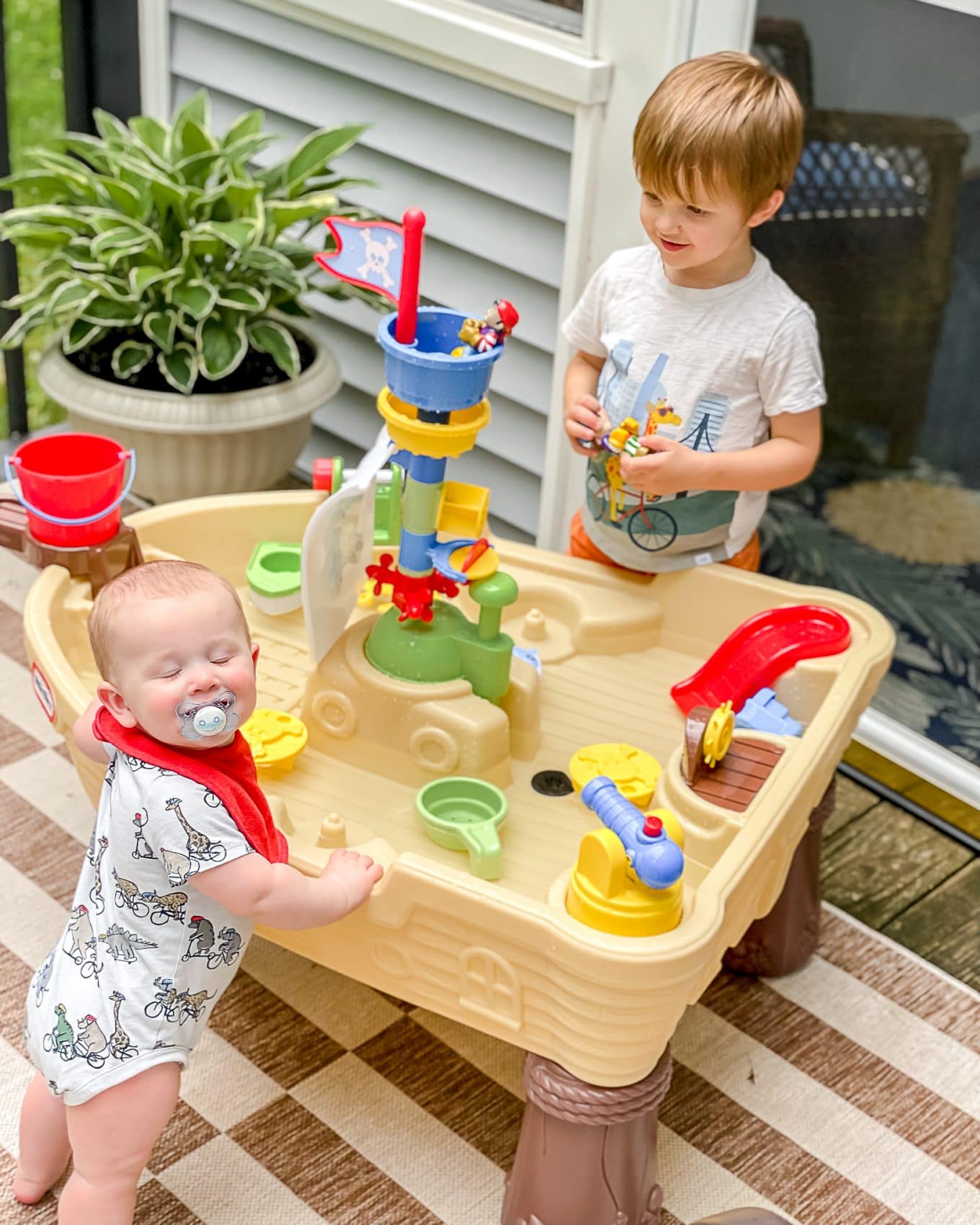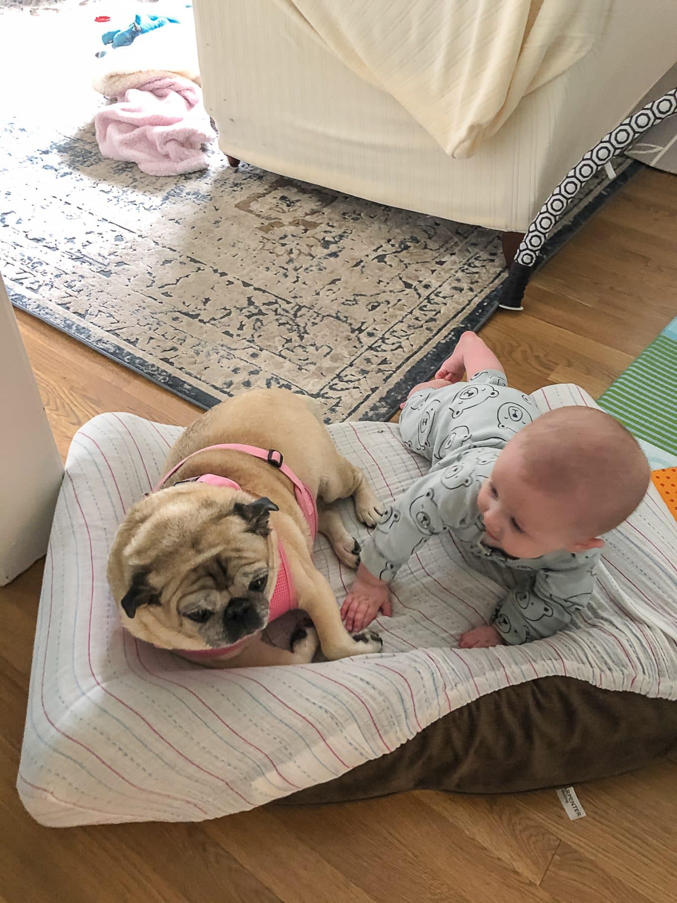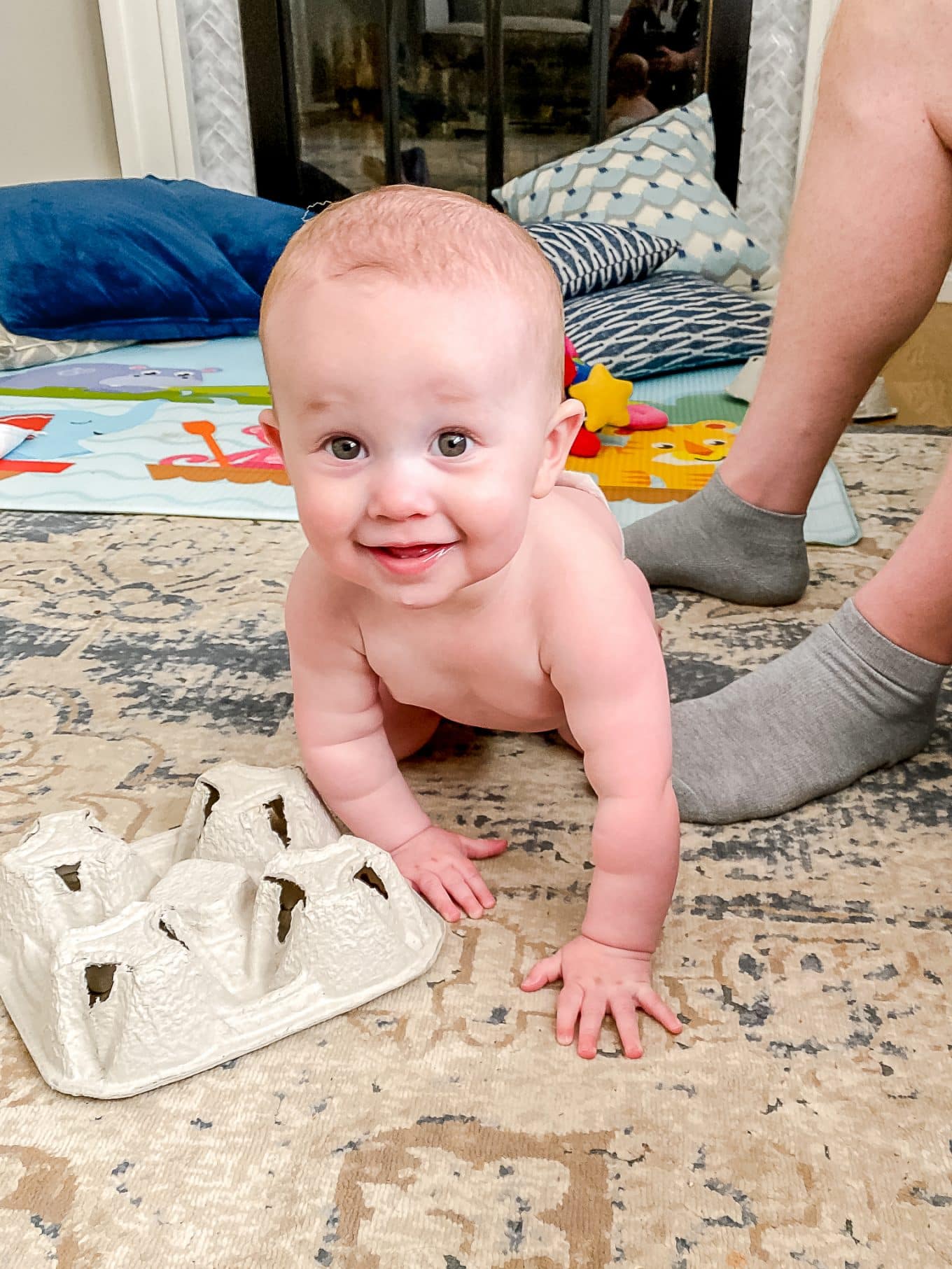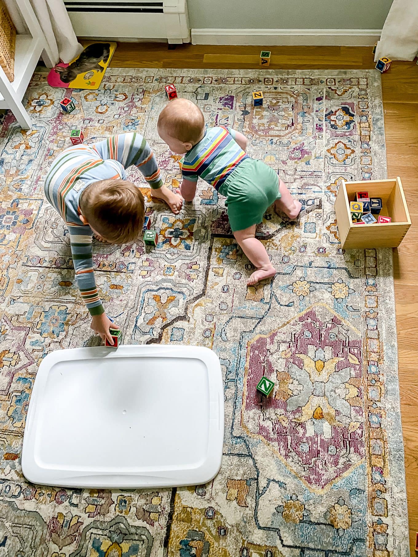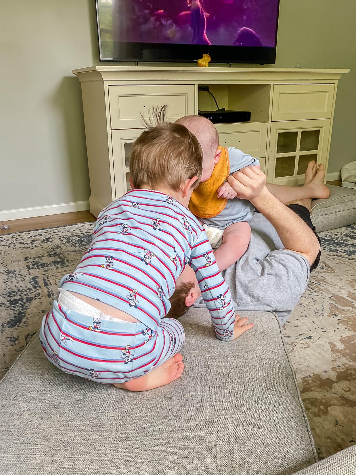 Simplemente: James. Él adora a James. La mirada en los ojos de Levi cuando ve a su hermano mayor… es como si una luz ardiese dentro de él. Desde el principio quedó claro que adoraba a James, y ahora que gatea por todas partes, puede “jugar” con su hermano, algo que a James también le encanta. James se había encariñado con Levi después de haber sido tan neutral con él durante los primeros seis meses. Pero también se ha vuelto más agresivo, especialmente cuando se trata de juegos. Gritó: “Levi, no es seguro” y lo empujó al suelo. Estamos trabajando para tratar de detectar cuándo James no está de humor para interactuar, pero tampoco queremos interferir constantemente con su relación mientras intentan descubrir cómo interactuar entre ellos.