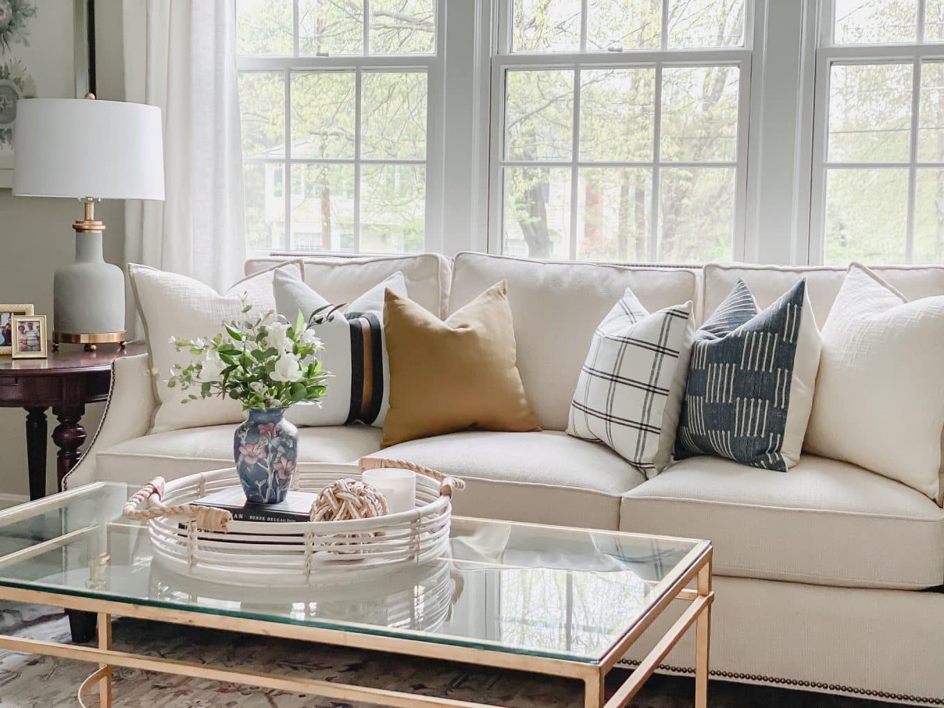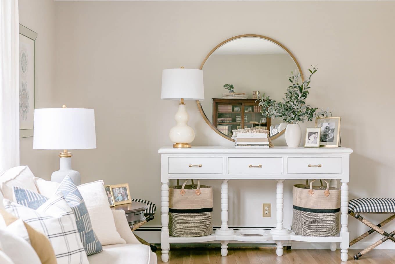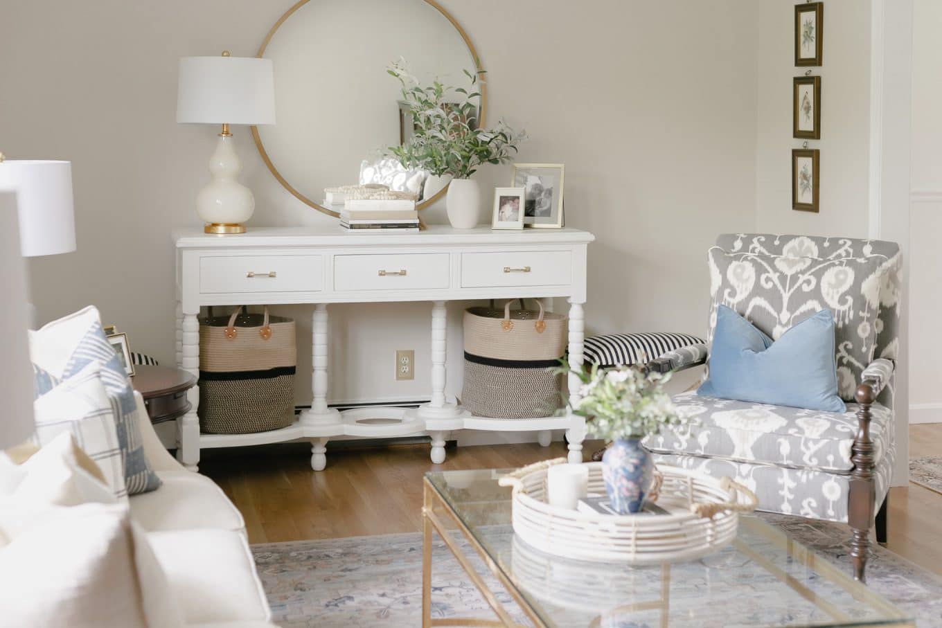 El estilo de mi hogar es un estilo de transición que combina tradición y modernidad. Me atrae todo lo relacionado con la luz, los colores brillantes, los colores neutros, los tonos cálidos de la madera y los elementos textiles naturales como el yute, el ratán y el ratán. Me encanta el color azul. Y aunque disfruto de muchas tendencias de diseño moderno (líneas limpias de mediados de siglo, sofás blancos, combinaciones de colores, muchas texturas tejidas), en última instancia quiero que mis interiores sean atemporales, espero que así sea. Así que incorporo piezas vintage tradicionales (como mesas auxiliares de caoba y alfombras de inspiración vintage) a esa estética moderna. Porque a.) nunca pasan de moda y b.) añaden riqueza y carácter (que de otro modo parecerían completamente modernos). Se siente un poco frío y plano).
