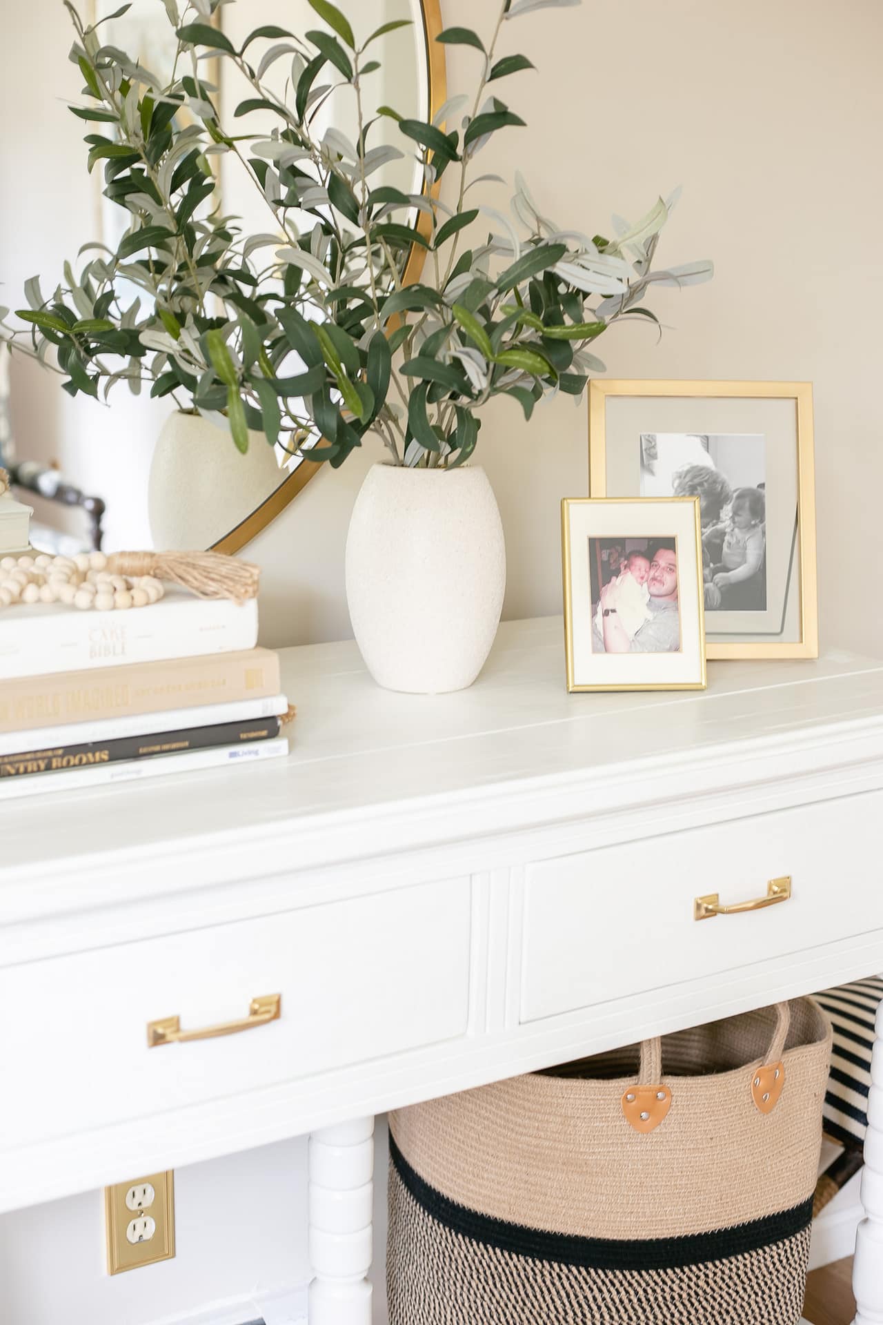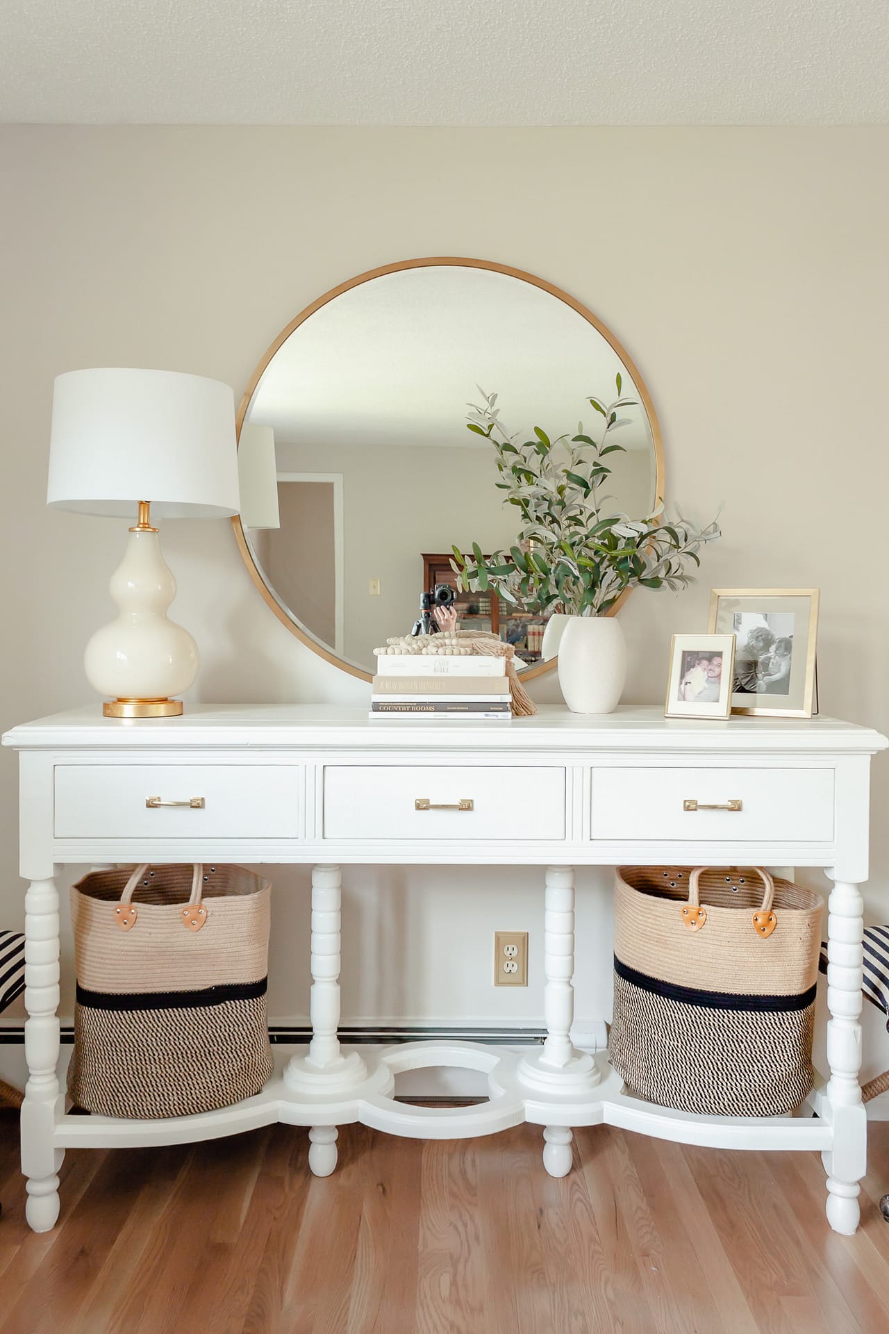 Mesa consola: Se encuentra en artículos para el hogar. de esta manera mesa justa Similar (¡reemplace la perilla con el tirador de latón vinculado a continuación!). Reemplazamos las perillas originales con estos tiradores de cajones Mission. rejuvenecimiento Fabricado en latón antiguo.