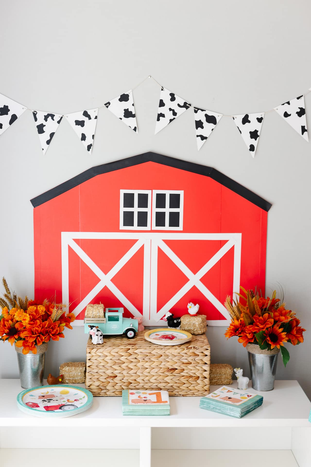 tenemos algunos Levi cumplió un año el fin de semana pasado ¡Y lo celebramos con una fiesta de primer cumpleaños con temática de granja! Era adorable y también un gran tema para una fiesta infantil de principios de otoño. Tirarlos a la basura puede resultar caro cualquier tipo de fiesta, sin mencionar una de Pinterest, pero pude mantenerla económica haciendo las decoraciones principales yo mismo: el fondo rojo del granero y la bandera con estampado de vaca. El resto lo compré en Dollar Tree y Party City, ¡más sobre eso a continuación!